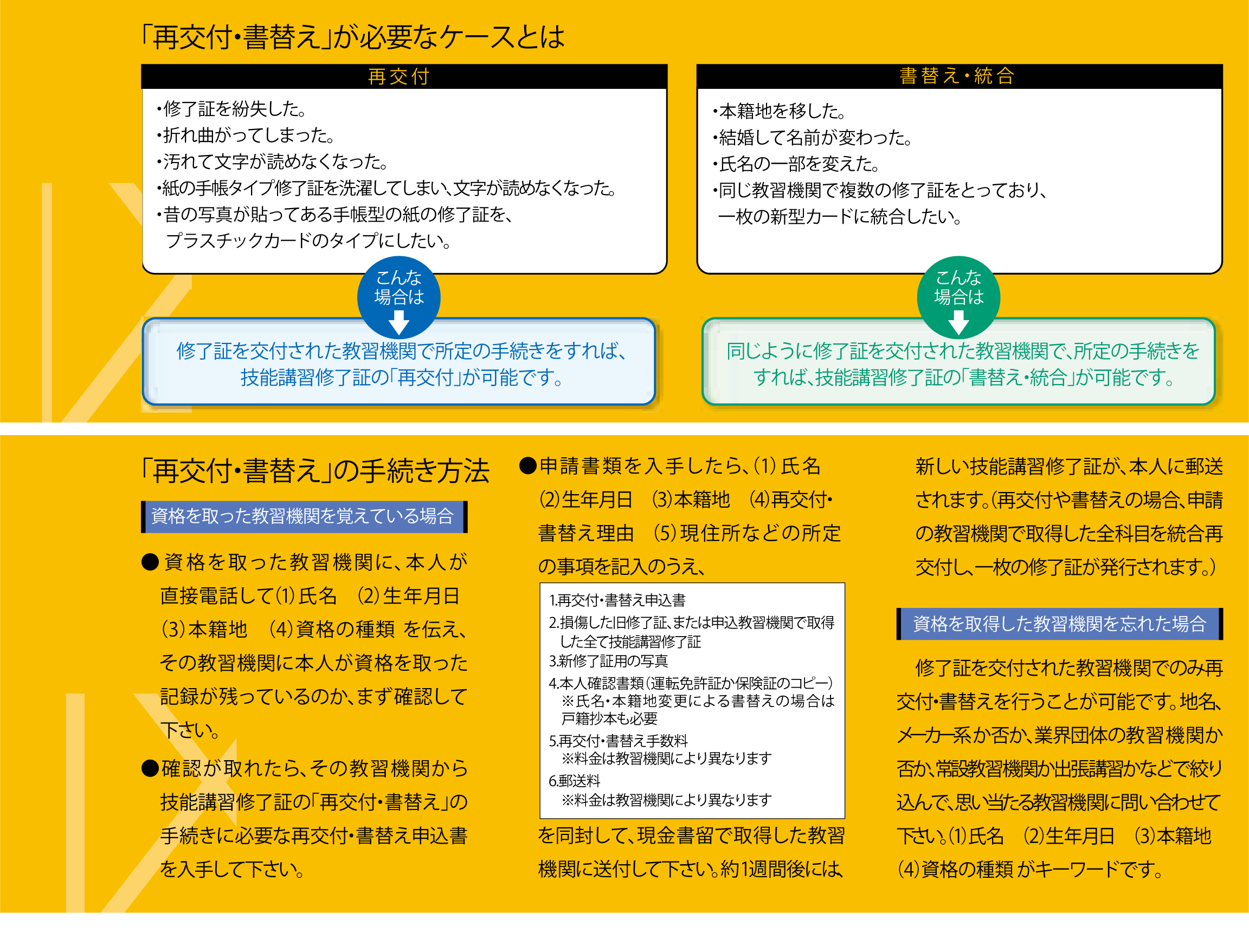 「修了証をなくしてしまった!」 「本籍や氏名を変更した!」 「古い修了証を新しくしたい!」プロのライセンスは、取得の教習機関で「再交付・書替え」が可能です。