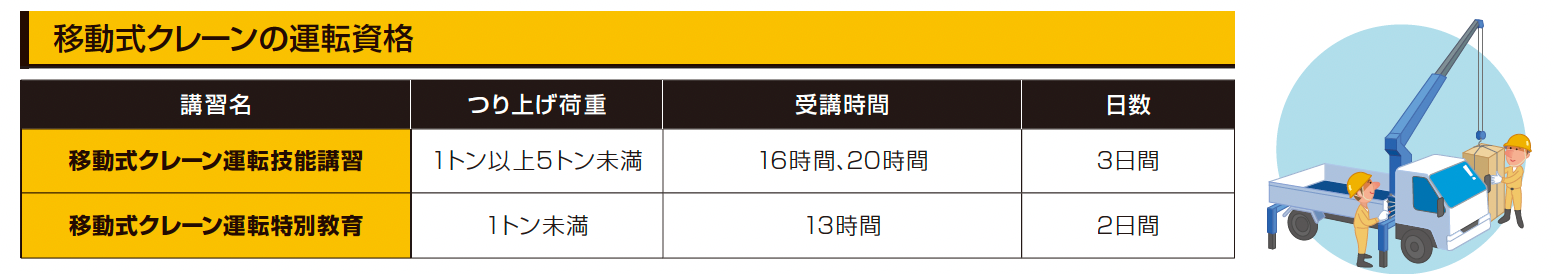 これら移動式クレーンの運転資格は、運転しようとするクレーンのつり上げ荷重によって必要な資格が変わります。 5トン以上の移動式クレーンは、移動式クレーン運転士免許保有者でなければ運転できませんが、1トン以上5トン未満の移動式クレーンは、技能講習修了者でも運転できます。また、1トン未満の移動式クレーンは、技能講習修了者か特別教育修了者が運転できます。