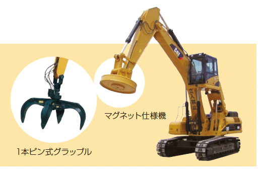 油圧ショベルをベースとしたクレーンの運転にも、車両系建設機械の運転資格に加えて、つり上げ荷重に応じた移動式クレーンの運転資格が必要になります。バケットリンケージ部につり上げ装置を追加装備したショベルクレーン仕様機や、バケットに替えてアーム先端にマグネットを装着したマグネット仕様機、同じくグラップルをピン1本のみで装着した1本ピン式グラップル仕様機が移動式クレーンに含まれます