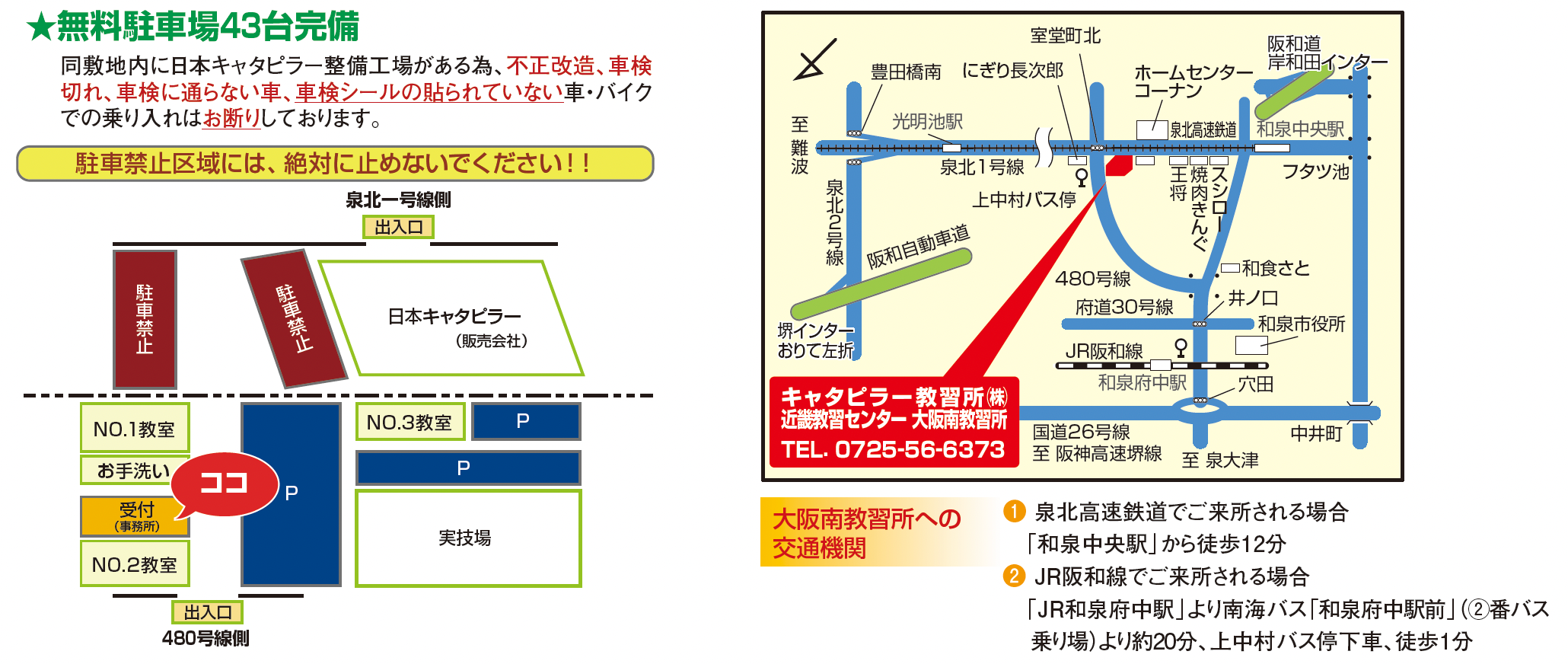 日本キャタピラー大阪南営業所と同居しています。南海電鉄泉北線「和泉中央」駅から徒歩圏内、車も泉北1号線の南端からすぐの場所にあり便利です。 大阪府南部では唯一のメーカー系教習所で実技を重視した講習を提供しています。出張講習にも対応しておりますので、お気軽にお声がけください。