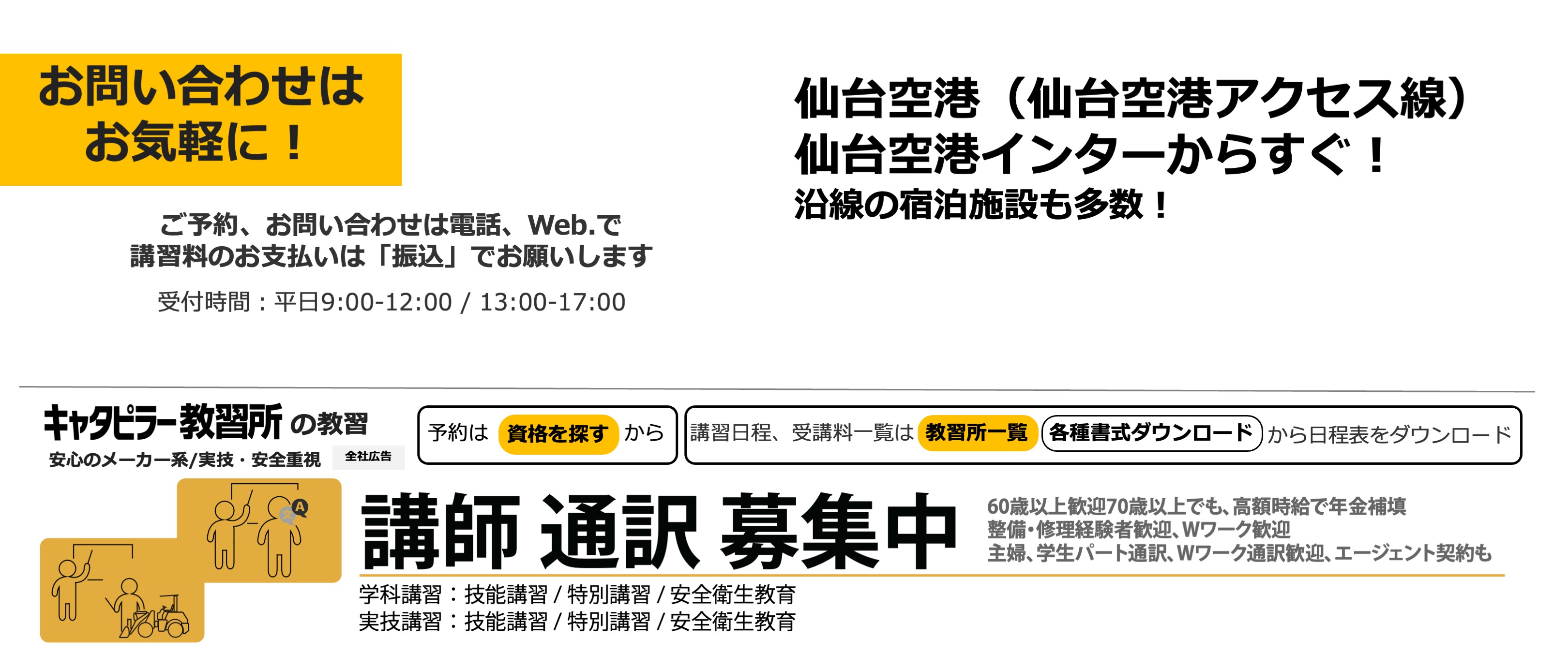 日本キャタピラー仙南営業所と同居しています。仙台空港インター至近で、仙台空港にも近く、仙台空港アクセス線からは徒歩で約15分です。 出張講習などお客様に寄り添った講習を心掛けていますのでお気軽にお問い合わせください。