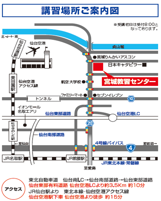 日本キャタピラー仙南営業所と同居しています。仙台空港インター至近で、仙台空港にも近く、仙台空港アクセス線からは徒歩で約15分です。 出張講習などお客様に寄り添った講習を心掛けていますのでお気軽にお問い合わせください。