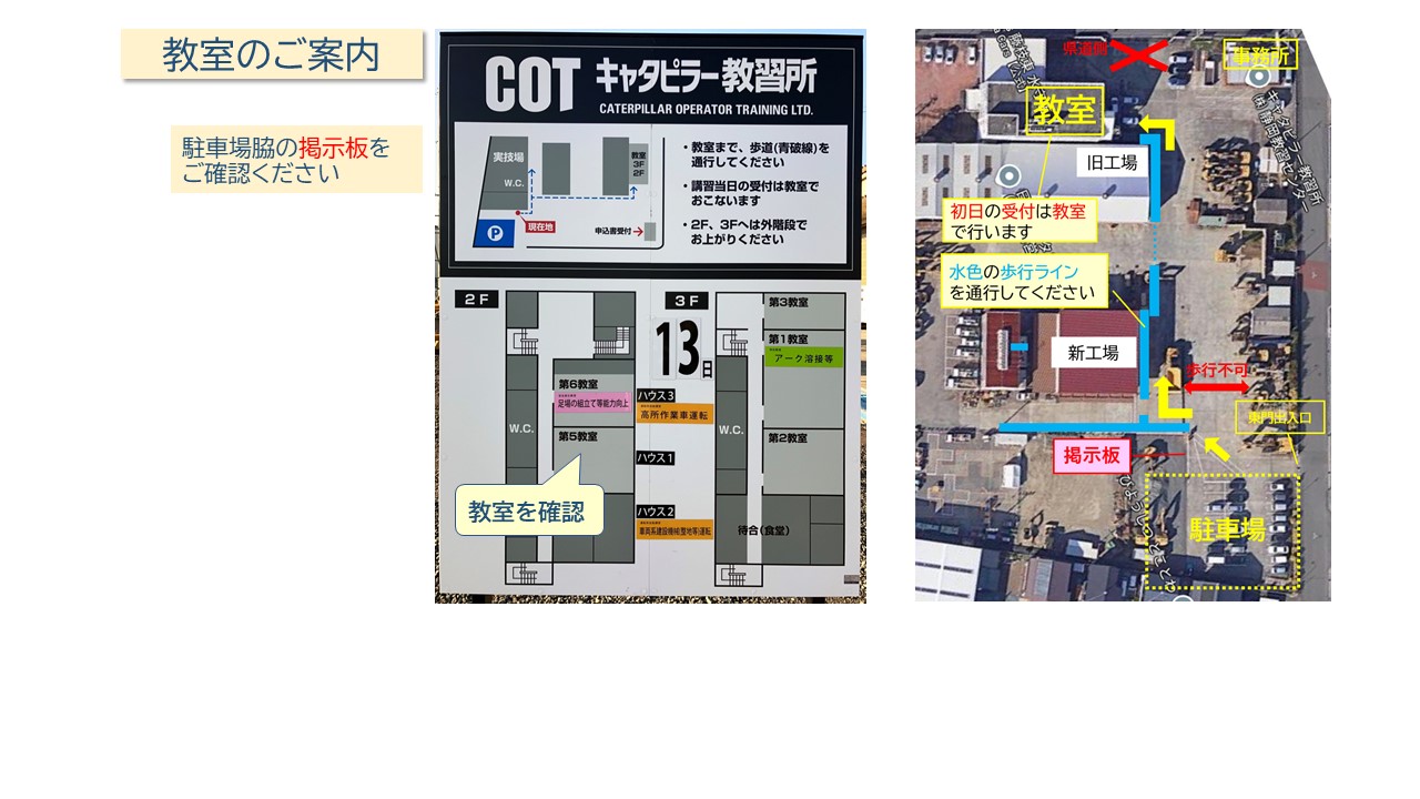 日本キャタピラー静岡営業所と同居しています。東名焼津インター、新東名藤枝岡部インターとも至近で、JR藤枝駅からのアクセスが便利です。 県内唯一の建設機械販売店直系教習所として充実した実技講習を提供します。出張講習にも対応していますので、お気軽にお問い合わせください。