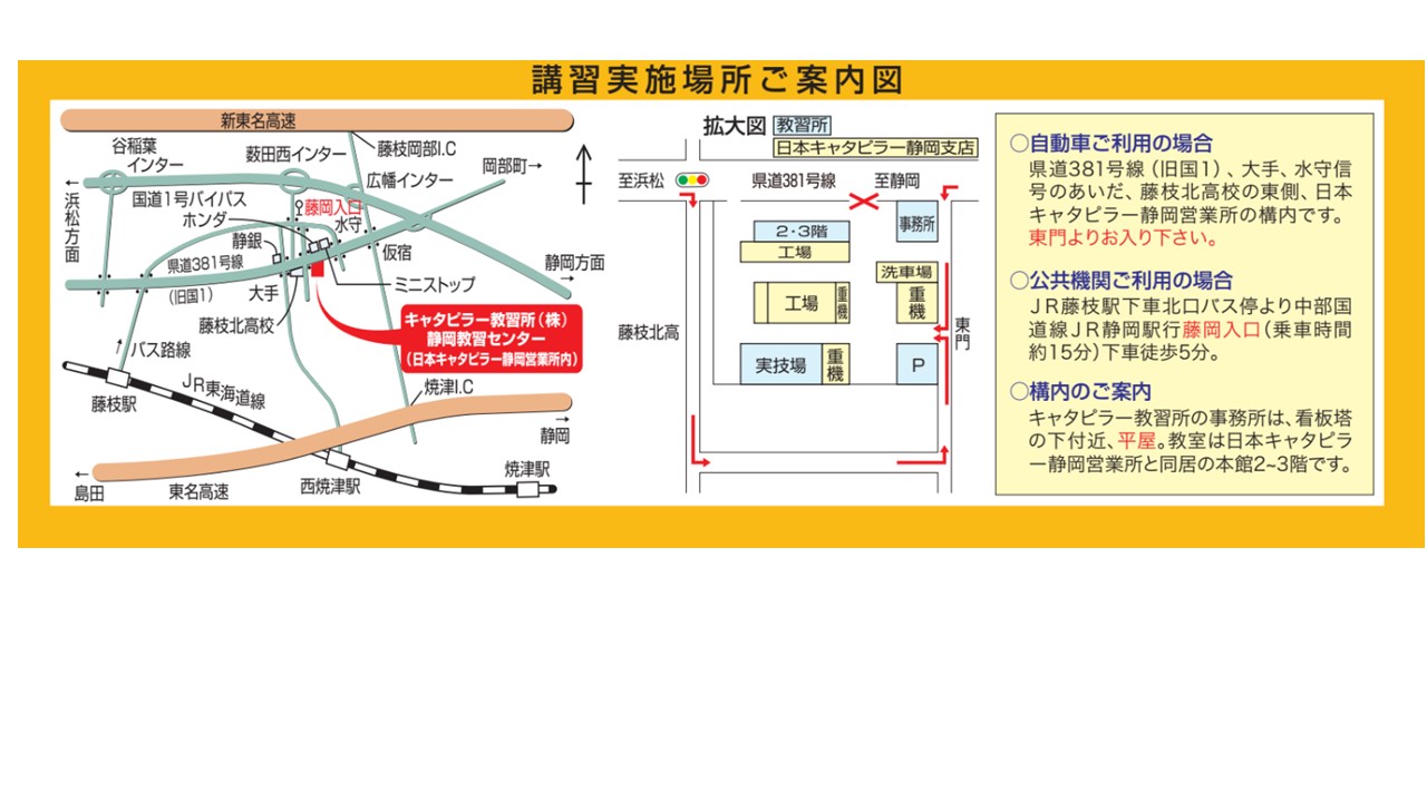 日本キャタピラー静岡営業所と同居しています。東名焼津インター、新東名藤枝岡部インターとも至近で、JR藤枝駅からのアクセスが便利です。 県内唯一の建設機械販売店直系教習所として充実した実技講習を提供します。出張講習にも対応していますので、お気軽にお問い合わせください。