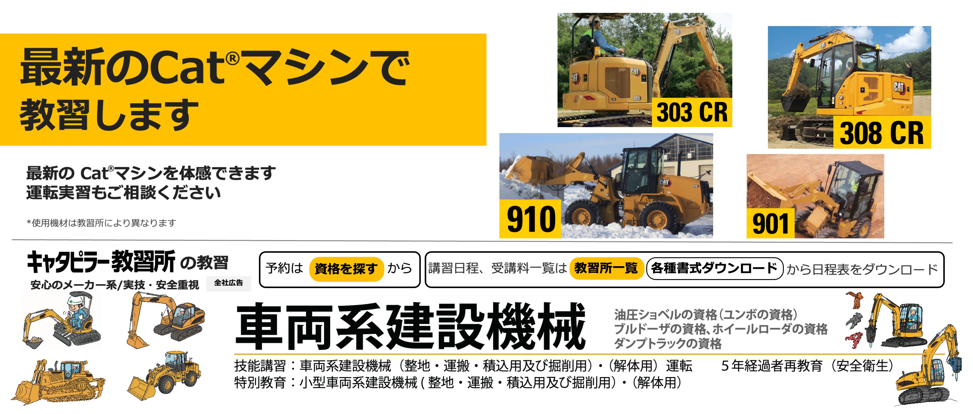 キャタピラー教習所は建機の教習所です(労働局長登録教習機関) 建設機械免許、フォークリフト免許資格、高所作業車免許資格、クレーン免許資格などの技能講習や、フルハーネスなどの特別教育、職長教育などの安全衛生教育を提供します