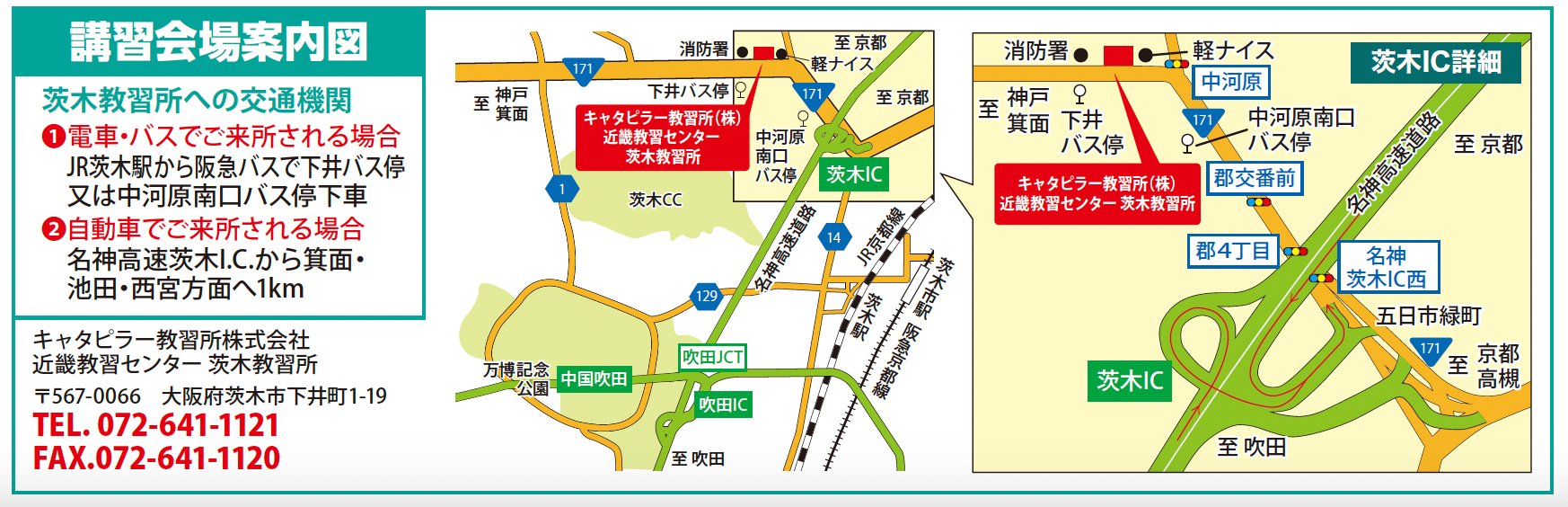 日本キャタピラー大阪北サービスショップと同居しています。名神高速道路茨木I.C.から約1Kmで、JR茨木駅からは下井バス停が便利です。 出張講習への対応や、数多くの外国語講習を開催しておりますので、お気軽にお声がけください。