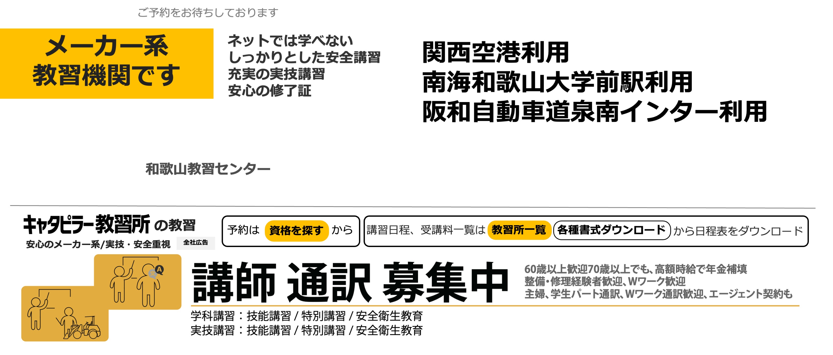 日本キャタピラー和歌山営業所と同居しています。和歌山北インターからのアクセスが便利です。車両系建設機械の講習以外にも、ガス・チェーンソー・低電圧など多数の講習を開催しております。また人数がまとまれば出張講習もご相談受け付けています。お気軽にお問い合わせ下さい。