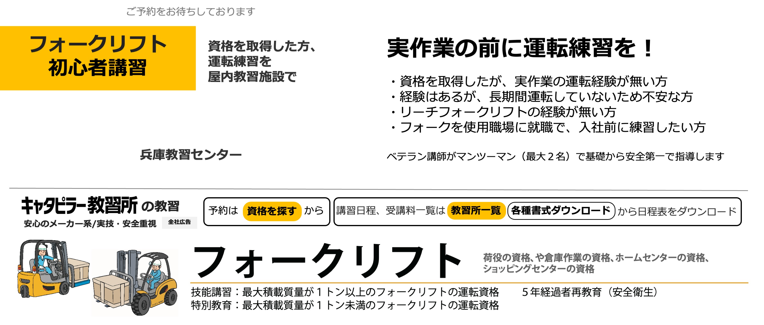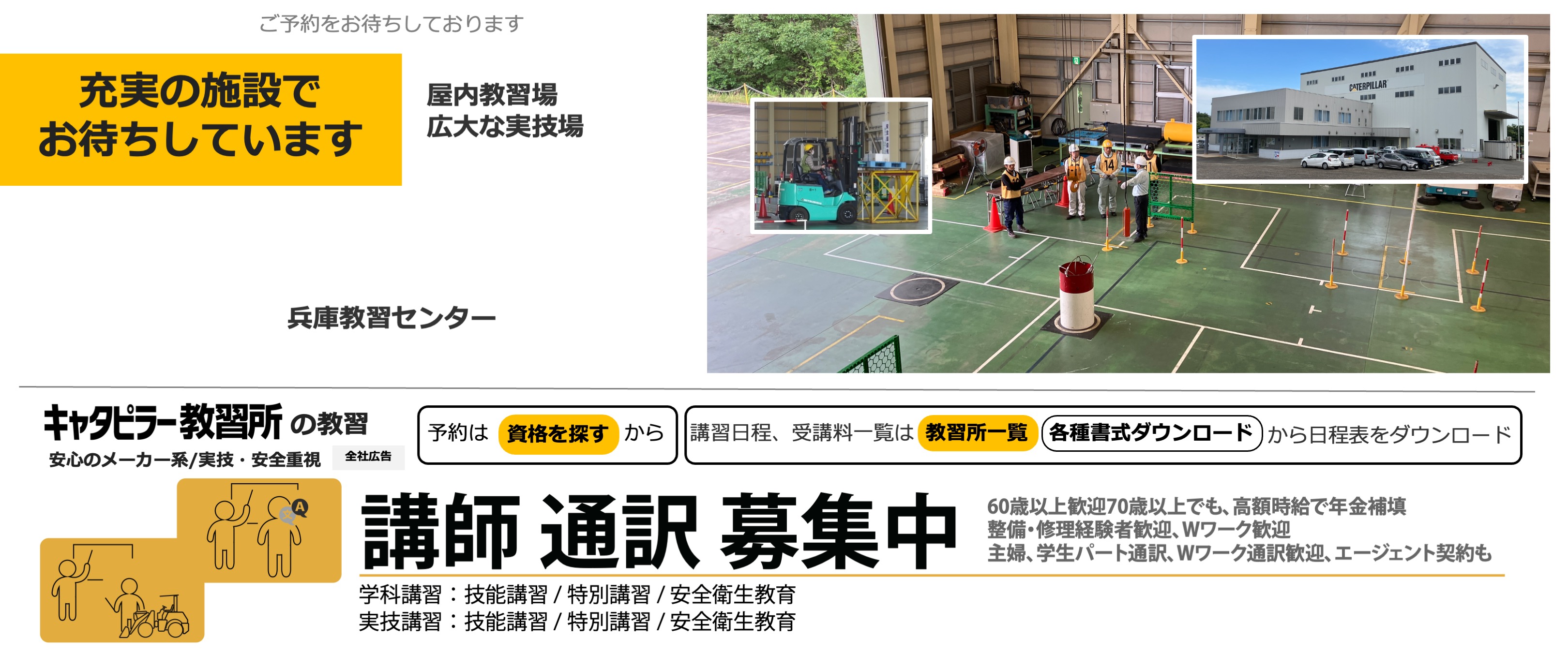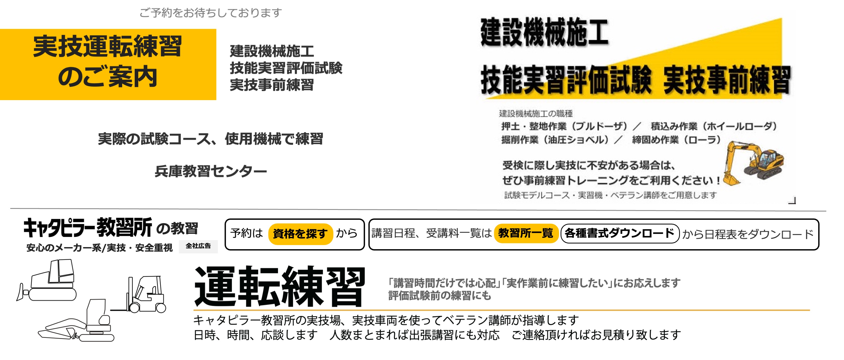 キャタピラー教習所は建機の教習所です(労働局長登録教習機関) 建設機械免許、フォークリフト免許資格、高所作業車免許資格、クレーン免許資格などの技能講習や、フルハーネスなどの特別教育、職長教育などの安全衛生教育を提供します