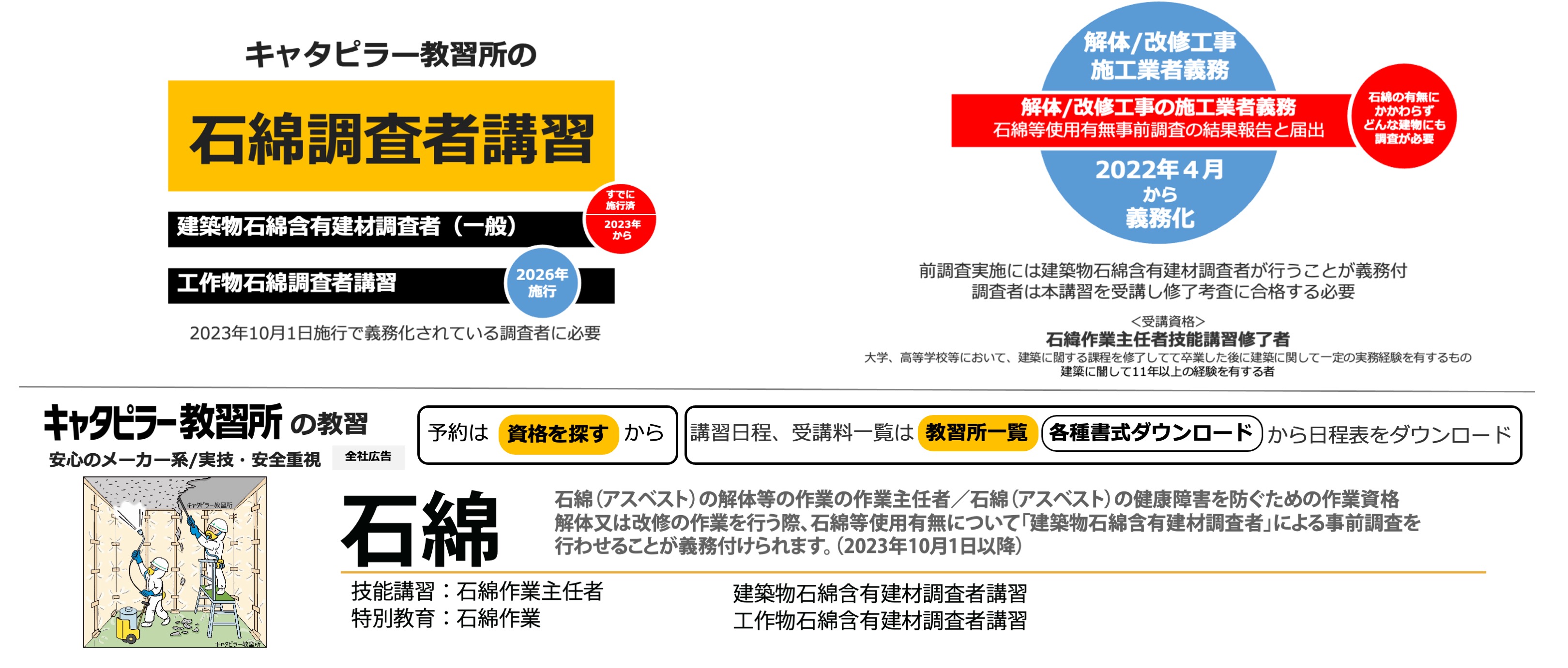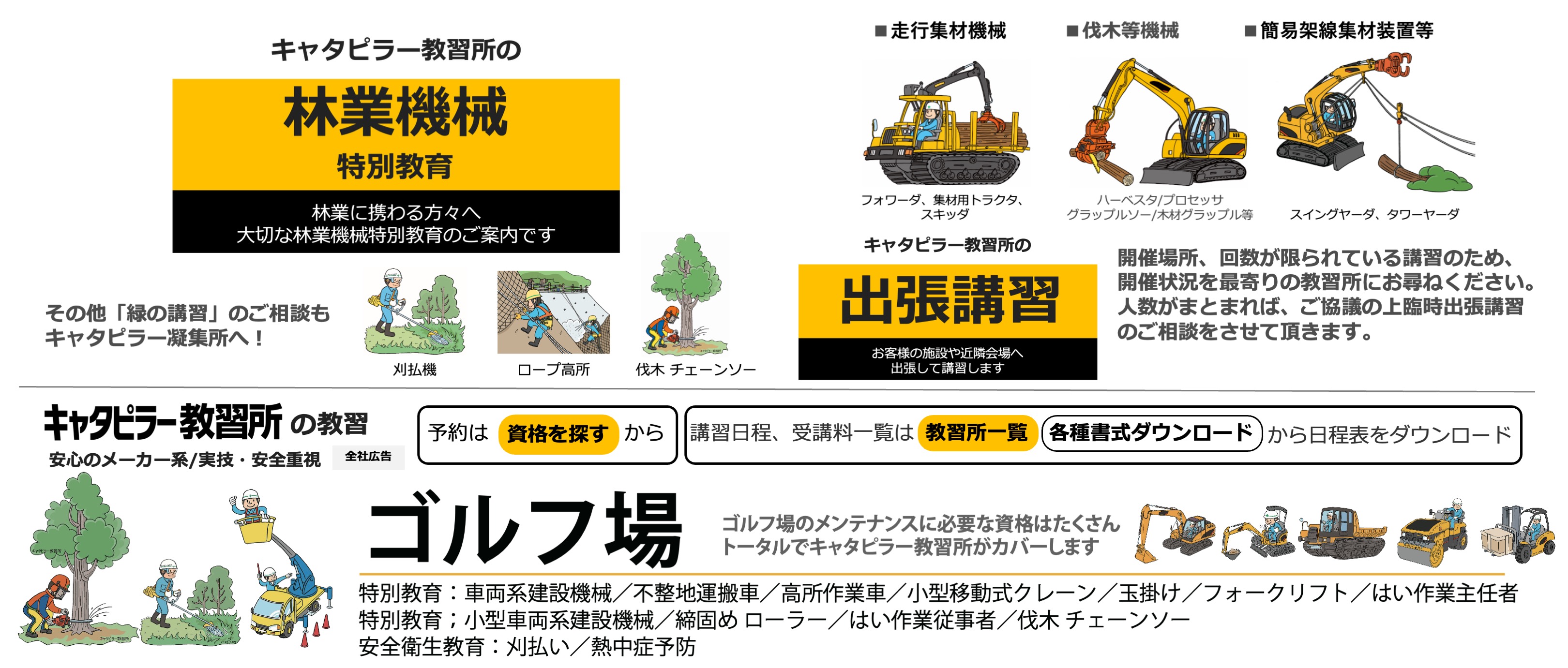 キャタピラー教習所は建機の教習所です(労働局長登録教習機関) 建設機械免許、フォークリフト免許資格、高所作業車免許資格、クレーン免許資格などの技能講習や、フルハーネスなどの特別教育、職長教育などの安全衛生教育を提供します